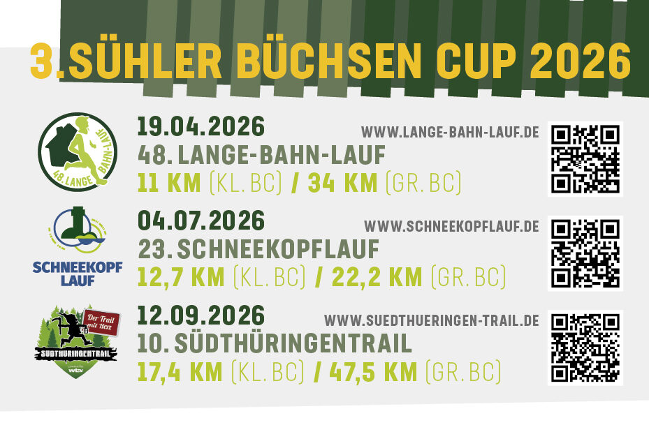 Die Traditionsläufe Lange-Bahn-Lauf, Schneekopflauf und Südthüringentrail haben sich zu einer Laufserie, dem SÜHLER BÜCHSEN CUP zusammengeschlossen. Alle Infos zum Cup findet ihr unter